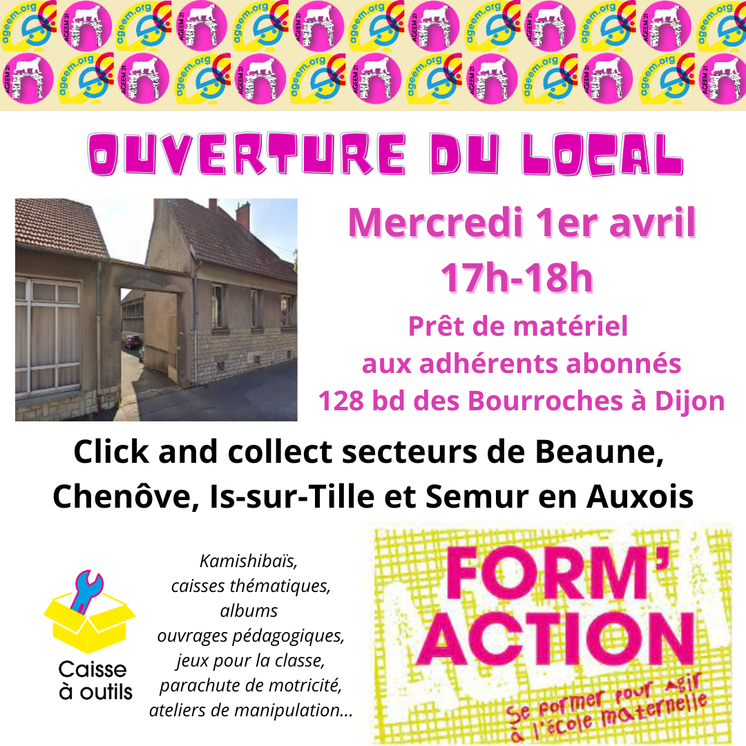 Si vous êtes trop éloigné du local, il est possible de réserver du matériel et de le récupérer dans les secteurs d’Is sur Tille, Semur en Auxois ou Beaune. Si vous ne pouvez pas venir le jour de l’ouverture du local, un retrait est possible à un autre moment à Chenôve. Formulaire de réservation: https://framaforms.org/click-and-collect-local-ageem-21-1662893784