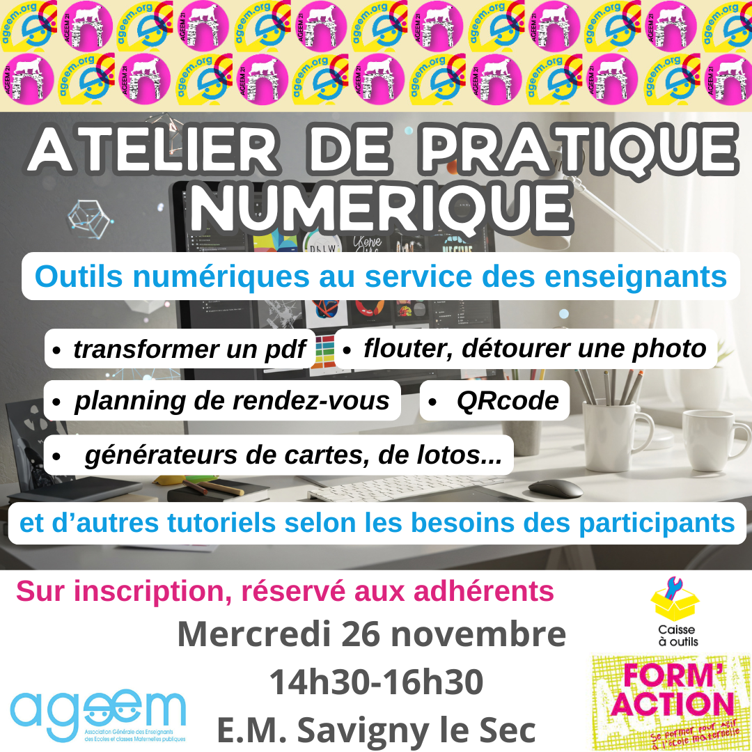 Les adhérents peuvent toujours s’inscrire à l’atelier de pratique du mercredi 26 novembre en suivant ce lien : https://framaforms.org/atelier-de-pratique-ageem-21-1734171544