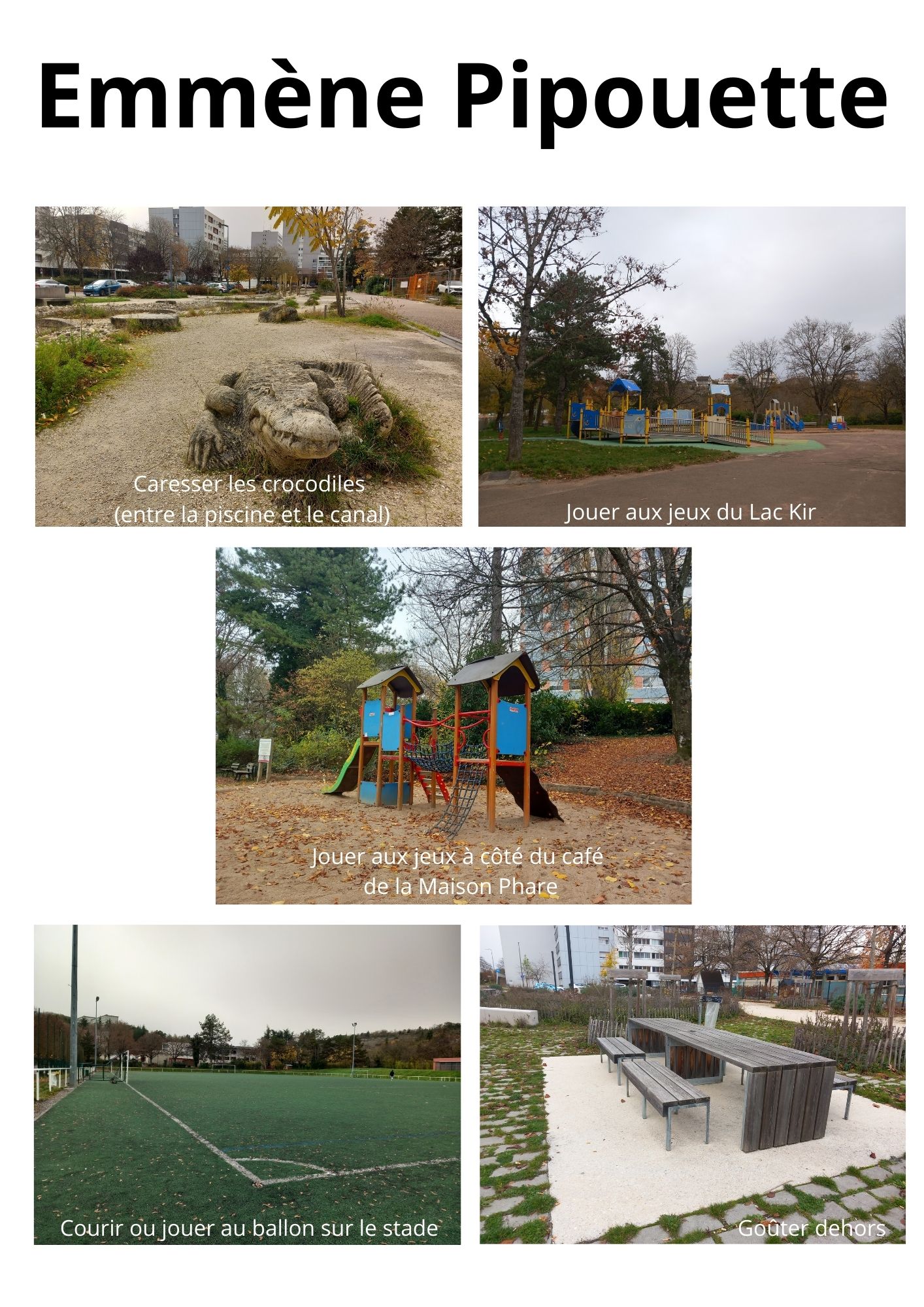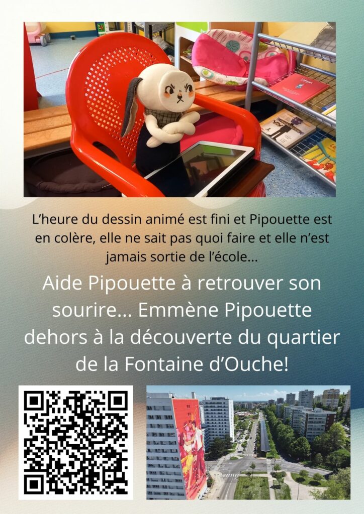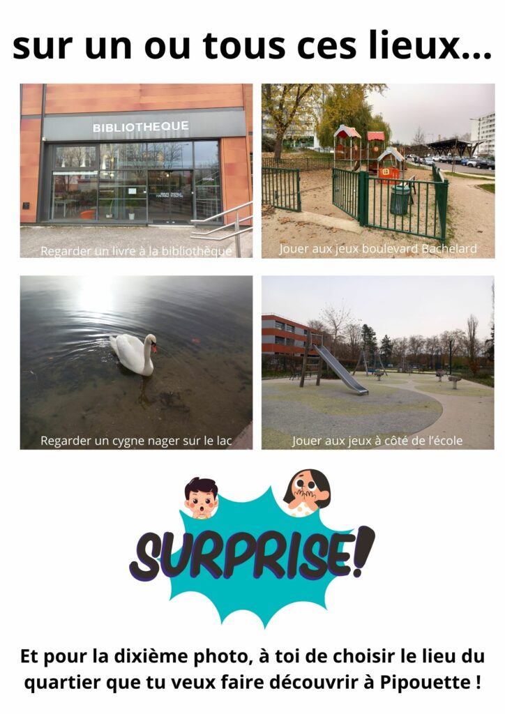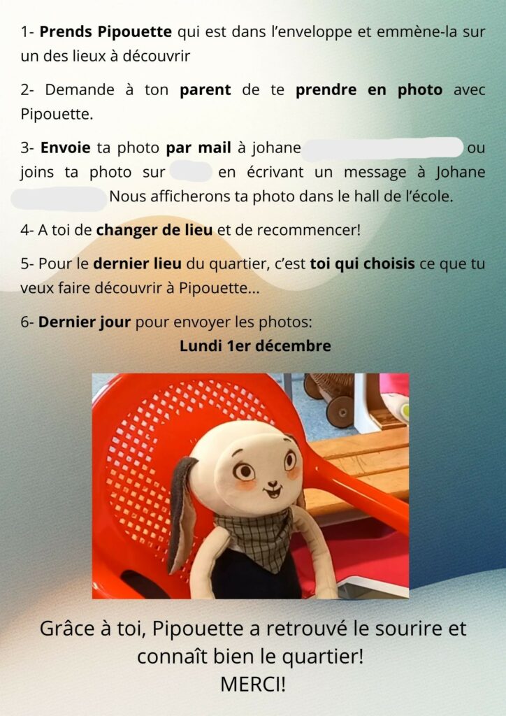 Dans le cadre des 10 jours sans trop d’écran de son école et pendant la quinzaine de la maternelle, Johane et l’équipe de l’école ont proposé aux familles d’emmener Pipouette (la mascotte du dispositif Moins de Trois Ans mais que les autres enfants connaissent) visiter le quartier en photos.