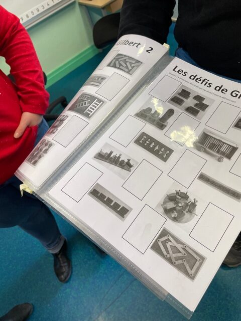 La consigne est visuelle : la photo du modèle à réussir. Les pièces sont éparpillées: l’élève doit tester, essayer, pour réussir soit seul soit avec l’aide de l’adulte. Puis il change de table pour un nouveau défi.